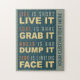 "Life is short - LIVE IT, Love is rare - GRAB IT, Anger is bad - DUMP IT, Fear is limiting - FACE IT". See my store for items with this design.