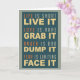 "Life is short - LIVE IT, Love is rare - GRAB IT, Anger is bad - DUMP IT, Fear is limiting - FACE IT". See my store for items with this design.