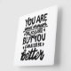 Black and white lino print of a motivational quote that says "You are good enough, but you can always be better". Offers encouragement for people to know that self-acceptance and growth go hand in hand.