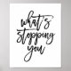 A black and white typography motivational quote that says What's Stopping You. Remind yourself to follow your dreams with this inspirational saying.