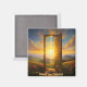 A radiant key glowing in vibrant golden hues, unlocking a door to a sunlit horizon with lush green fields and a clear sky.