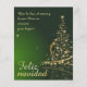 Motivo de Navidad verde con árbol de Navidad hecho de estrellas doradas con las palabras Feliz Navidad en alemán, en español, en francés, en inglés