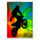 The sports action and energy of motocross athletes are captured in silhouettes of action figures demonstrating extreme tricks and stunts on their motorcycles. Digital paintings and illustrations of these teens and young men include backgrounds of bright, vivid colours and splashes and bursts of light to highlight the action. They also show off in grungy and edgy off road scenes where competitors earn their street creds showing off their motocross skills.