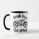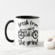 A coffee mug featuring a monochromatic retro motorcycle, with the phrase "Break from the Grind" centred around the image. The design suggests a sense of adventure and freedom, offering a peaceful escape from the daily routine.