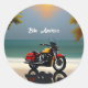 A beautiful motorcycle is parked on a beach under a cloudy blue sky.
