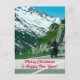 Christmas postcard for bikers has a photo of a motorcycle rider in snowy mountains. Text at the bottom says Merry Christmas & Happy New Year, or edit to your own personalised greeting.