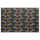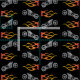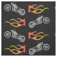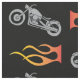 Motorcycle silhouette in gray with orange biker flame in a repeating pattern on black background.