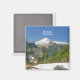 The snow-covered peak of Mt. Baker rises into the clear blue sky. It's a sunny day in the Pacific Northwest. Below the mountain, evergreen trees stand tall before a small alpine lake with beautiful turquoise color. Mount Baker, also known as Koma Kulshan or Kulshan, is a prominent volcano in Washington state's North Cascades. Bring this scenic view of the Cascade Mountains to your home with this magnet. You can customize the text to give the magnet your own message. This landscape photo is also available on round magnets in three sizes. Enjoy choosing your favorite way to enjoy this magnificent scenery.
