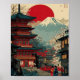 Capture the timeless beauty of Japan with this stunning Mount Fuji and red pagoda poster. Featuring a bold rising sun behind snow-capped Mount Fuji, a traditional multi-tiered temple, delicate cherry blossoms, and a peaceful riverside scene with figures in kimono, this artwork blends classic Japanese culture with elegant modern composition.
