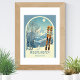 Poster from a wonderful ski resort holiday in the beautiful mountains of Mount Marcy New York. This small poster features an arch with a stunning blue-grey mountain landscape and retro ski boards in an orange tribal pattern in the foreground. The design is a lovely combination of retro and modern, and I hope you enjoy it!