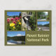 Postcard featuring photos taken at Mount Rainier National Park. Photos include Christine Falls, Reflection Lake, the park entrance, wildflowers, and Tahoma Creek.