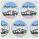 A black and white line art illustration of Mount Rainier, and the Jackson Hole valley. The lake and the sky a painted in blue watercolors the create a dramatic mountain landscape.
