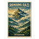Travel poster featuring Mount Romaing Razi, Myanmar, in a classic retro travel-poster style. Central focus on the rugged, cloud-wrapped mountain peak rising above dense emerald forests and misty valleys, conveying extreme remoteness and untouched wilderness. Soft sunrise light breaks through drifting clouds, highlighting dramatic ridgelines and wild highland terrain. Cool, majestic color palette of mist white, deep jungle green, slate blue, and pale gold. Clean graphic illustration with subtle vintage grain texture. Striking vintage typography headline: “ROMAING RAZI – EDGE OF THE UNKNOWN”. Vertical 2:3 layout, high-resolution, print-ready.