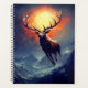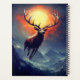 Simple grey mountains with ball of fire representing the disaster this giant buck is running from.