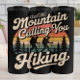 This retro-inspired graphic features the inviting phrase "Mountain Calling You Hiking" in bold, stylised typography. Silhouettes of two hikers with backpacks and poles are set against a vibrant striped sunset or sunrise. Flanked by pine trees, the design beautifully captures the allure of outdoor adventure, evoking a sense of peaceful exploration and nature's pull.