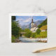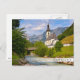 Photo postcard of a landscape with a church next to a mountain stream with in the background Alps mountains on a summer day in Ramsau bei Berchtesgaden in Bavaria, Germany, next to the border with Austria with a fading white bar and the text 'Germany'.