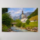 Poster print of a landscape with a church next to a mountain stream with in the background Alps mountains on a summer day in Ramsau bei Berchtesgaden in Bavaria, Germany, next to the border with Austria.