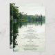 This Mountain Lake rustic wedding details card features a beautiful rustic scene under an overcast sky with lightly rippled but calm water reflecting distant evergreens, cedar trees and rock structures, perfect for a mountain, lakeside, or riverside wedding celebration - by katz_d_zynes | part of the Mountain Lake rustic wedding collection >> https://www.zazzle.com/collections/119499271518309609