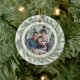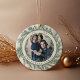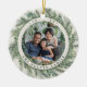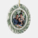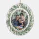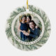 Elegant holiday photo ornament features a favourite photo on each side, framed by a wreath of lush green botanical pine foliage on a warm ivory background. Personalise with your family name and the year curved around the photo.