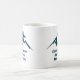 A cool mountain range real estate company mug for a realty business located in a mountainous city or town. The realtor name is written in navy blue script under the house among mountains. Great marketing gift for a mountaintop home builder.
