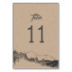 Rustic wedding table card for beautiful wedding in natural surroundings with kraft paper background and decorative font w mountain and forest illustration on the bottom