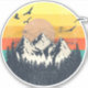 Retro style illustration of mountains at sunset design with mountain peaks, birds, sun, pine trees decoration of colourful striped retro style background