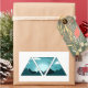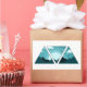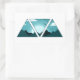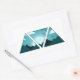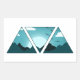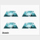 A mountain landscape with a sun and birds within three triangles in shades of blue, turquoise, and cyan.
