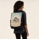 A backpack with an outdoorsy minimalist style. Designed with an illustration of a mountain with sunrays emanating from behind. The word wanderlust written below. Background is a parchment colour with a hint of blue. A design that may appeal to outdoor types involved in backpacking. hiking, mountain climbing, and camping.