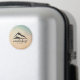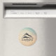 A magnet with an outdoorsy minimalist style. Designed with an illustration of a mountain with sunrays emanating from behind. The word wanderlust written below. Background is a parchment colour with a hint of blue.