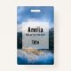 Name badge with a beautiful nature photo. Mountains in the background with a calm still lake in the foreground. Serene and relaxing photograph.