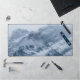Close up landscape photograph of majestic mountains covered in snow and fog.