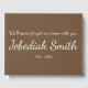 This plain funeral/memorial condolences guestbook features the message "We’ll never forget our time with you,", and the personalised name and birth/death dates of the individual who has passed away. It could be used to record cherished memories of somebody who has recently passed on. It has a brown background, and white text.