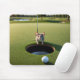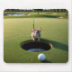 A whimsical mouse on the edge of a golf course hole on the green near a golf ball