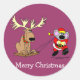 A cute little mouse dressed as Santa is having a hard time getting one of Santa's Reindeer to give him a lift back to the North Pole.