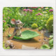 A small mouse navigates a muddy puddle using a curled leaf as a boat, surrounded by vibrant pink and white flowers and lush greenery