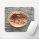 Eine grosse, leere, hellbraune Baumnusshälfte auf dunkelbraunem Holz ist das Motiv auf diesem Mousepad.