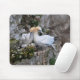 Pair of mated gannets on the nest with the chick snuggled underneath. Photographed at RSPB Bempton Cliffs Yorkshire