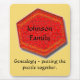 Title: "Genealogy - putting the puzzle together" Personalise with your family name, superimposed over red hexagon shaped jigsaw puzzle.