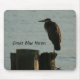 This Great Blue Heron, seated on some old pilings, is almost silhouetted against the light blue waters of Commencement Bay in Tacoma, WA. Against the blue-grey water is the black lettering, "Great Blue Heron."
