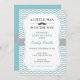 Modern Baby Shower Invitation featuring a turquoise and grey chevron pattern background and a dark grey moustache graphic. Perfect for a "Little Man" or "Moustache Bash" themed Baby Shower for a baby boy.