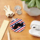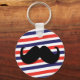 This fun graphic design features a black moustache with a red, white and blue barber pole stripped background.