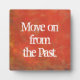 A typography quote that says move on from the past in big bold white lettering. The background is an artistic looking red, orange and brown abstract design. Mottled texture and scrapes painted to give it an old weathered grunge style feel.
