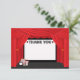 This cool birthday party thank you flat card has an at the movies theme! There are layers of red curtains all around a "screen" in the middle. At the bottom, there is a box of popcorn, a cup of soda, and a movie snapboard with a few pieces of popcorn on the ground. At the top of the movie screen, thank you is written with two stars. Some elements are © 2012 Jessica Weible/JW Illustrations.