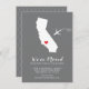 Modern moving announcement featuring the state of California with a red heart & aeroplane set on a grey background. The background colour can be changed easily by clicking personalise and then click to customise further to view our colour picker. From there you can also move the aeroplane & heart! Contact our shop if you require help or need another state.