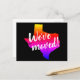 Neon colour moving postcards with vintage Texas state map silhouette. Custom moving text; We have moved or I've moved. Add your new address on the back. Modern moving cards for home and business. Neon rainbow colours filter effect design with stylish brush script typography. Customisable background colour. Also nice for housewarming party, relocation, pension etc.