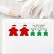 Custom address labels for the family that games together! This label features 5 meeples: 2 red meeples for the adults (Mr and Mrs Claus) and 3 green meeples for the children (little helper elves). All meeple have matching hats, which can also be customised for your preferred colours. Each meeple has a initial/name across the chest in a cute sketch-like font as if it were engraving on a wooden meeple, in white or your custom colour.