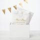 Elegant custom wedding favour bags include a modern and minimal "Mr and Mrs" design in heart calligraphy script featuring a monogram of the married couple's last name and wedding date in stylish text that can be personalised, along with a simple and sweet thank you message to guests. Note, the gold and white colour scheme can be customised to coordinate with your wedding colour scheme.