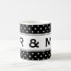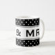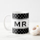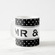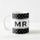 Funny Mr and Mrs mug for newly weds. Ideal for weddings, wedding receptions, rehearsals and bachelor or bachelorette party. Elegant black and white polka dot pattern design. Personalizable classy text and background colour. Make it a mister and misses favour gift! Change background colour behind dots to match any wedding theme. Any colour is possible ie pink, red, turquoise, grey, blue, green, orange etc. Personalise it with your own text and choose any font from elegant to modern. White polka dotted pattern design for just married couple.