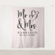 Modern custom light pink photo backdrop tapestry for your wedding reception or other wedding events with "Mr & Mrs" written in a large elegant script and an illustration of two hearts joined together. Add your married name and wedding date.
