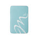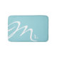 Stylish contemporary bath mat done in aquamarine, with white typography script text reading Mr. Matching Mrs. bath mat and bathroom accessories are available. Comes in three sizes.